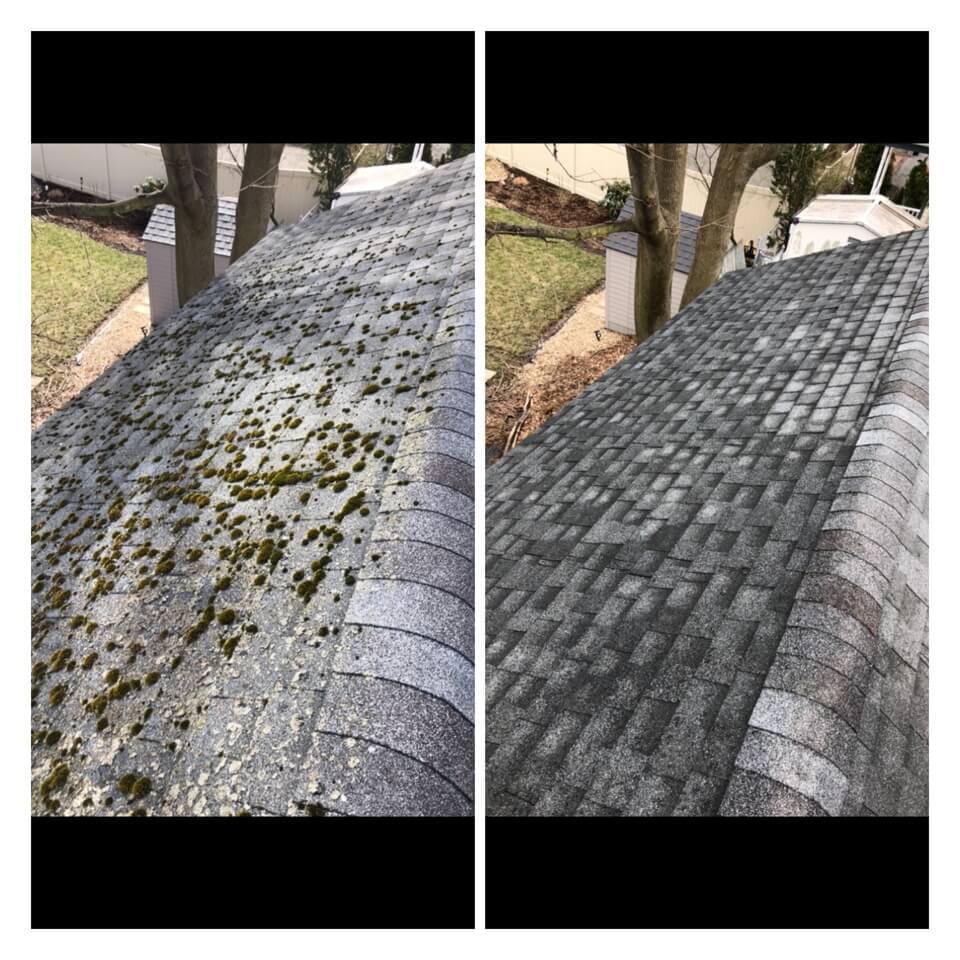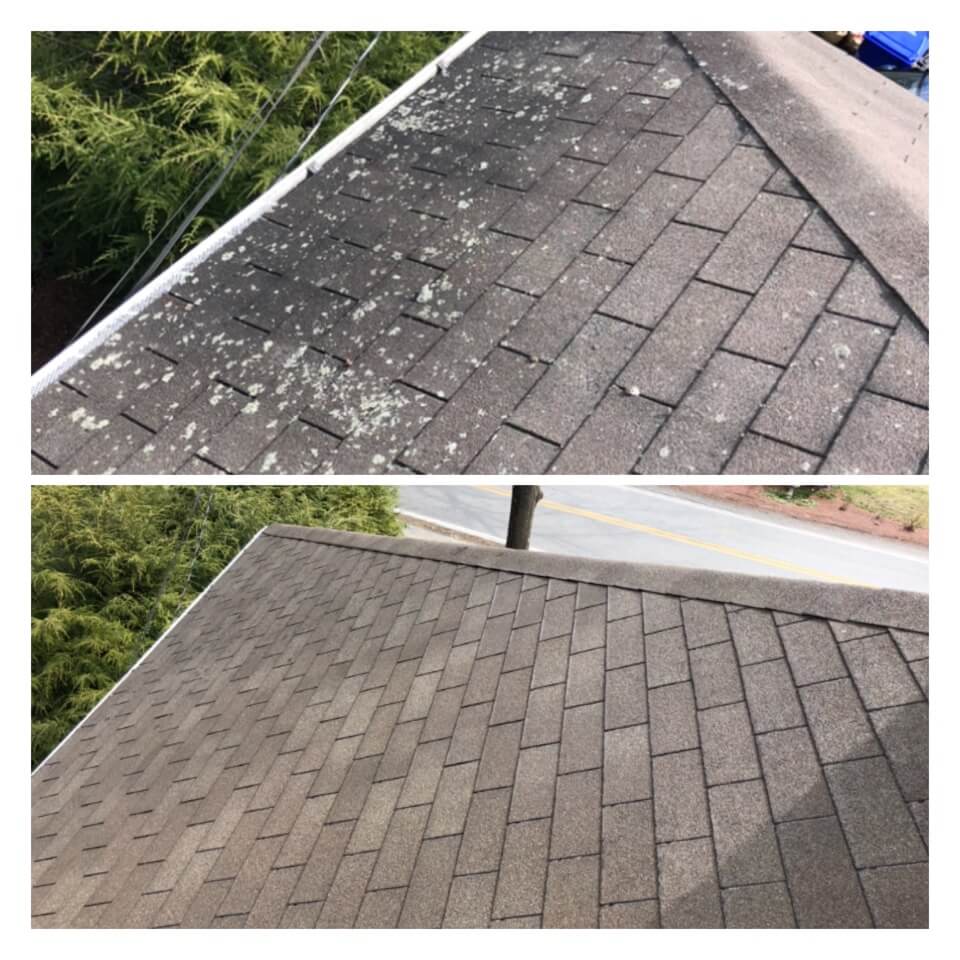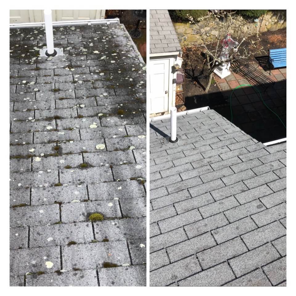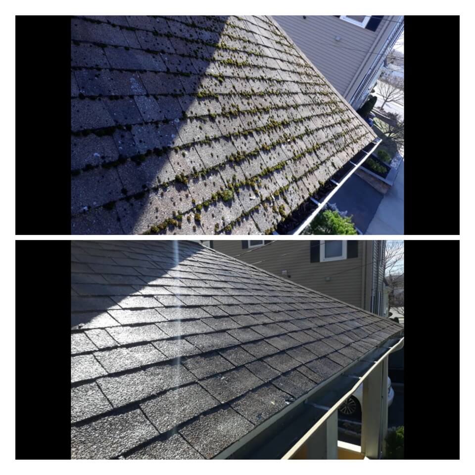 HiCleaners is the most experienced company in Southborough, MA that deals with roof washing and roof soft washing. All of our employees are trained to recognize precise solution mixing ratios to provide you with the safest and most effective soft washing service. Roofs are a commonly neglected part of a house due to the fact that most people don’t have ladders to access it, so it is very easy to just leave it alone and forget about problems that may start to arise. Just like many home owners, discoloration and small bits of moss on a roof can be overlooked because of the misconception that it is just aesthetic. However, it isn’t just aesthetic, the moss slowly lifts the granules off the shingles which in turn shorten the life of the shingle. The moss also spreads, just like any bacteria if it is left alone for too long, it can quickly become a problem that spirals out of control. Call HiCleaners for a free quote, we only use the most advanced eco-friendly solutions and equipment to make sure the job is done right, for the safety of the employees, your plants, grass, pets, and children.